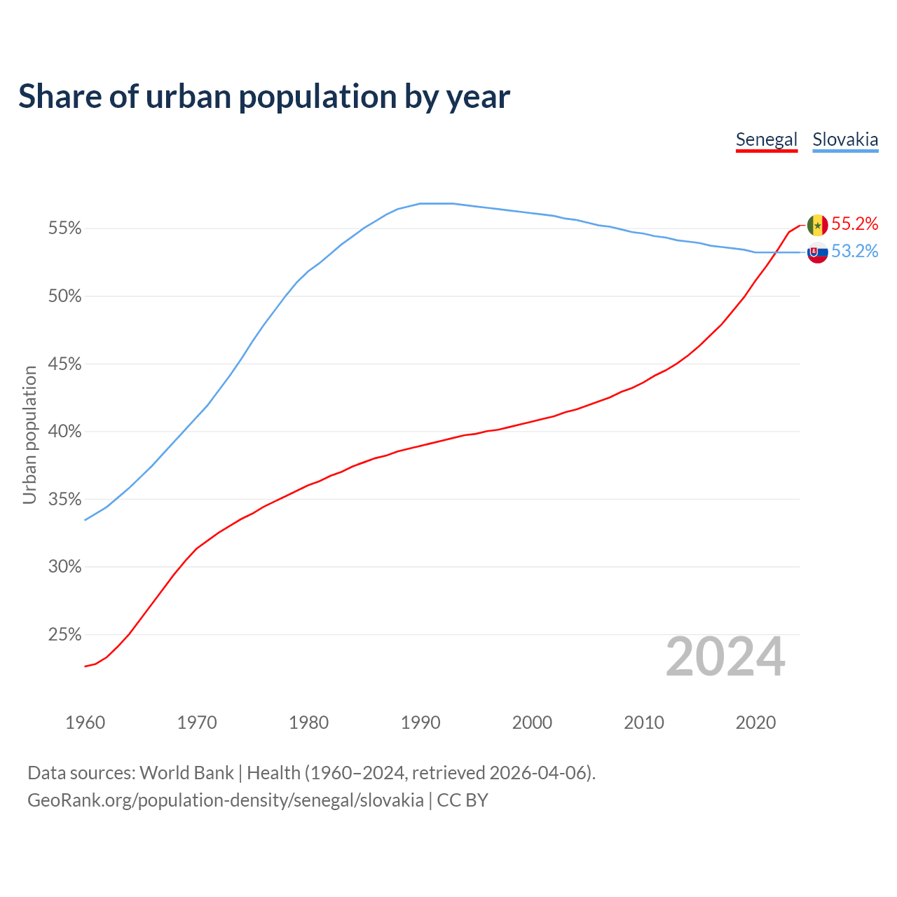 From 2004 to 2024, the share of urban population changed from 41.6% to 55.2% in Senegal and from 55.6% to 53.2% in Slovakia.