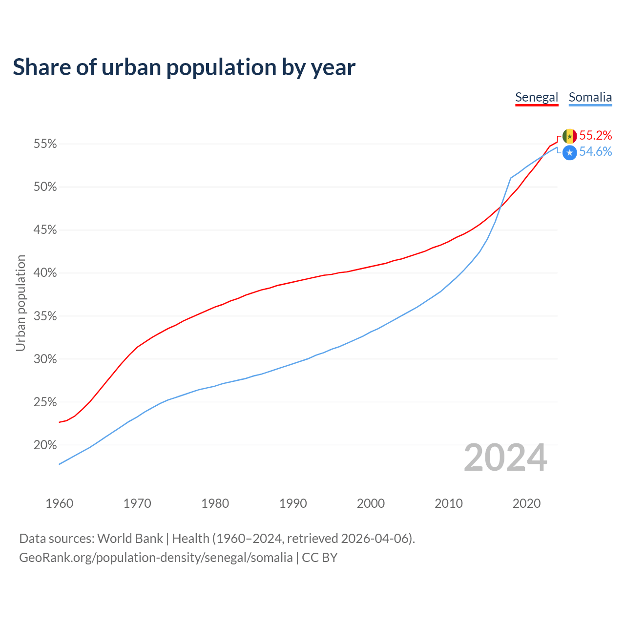 From 2004 to 2024, the share of urban population changed from 41.6% to 55.2% in Senegal and from 35% to 54.6% in Somalia.