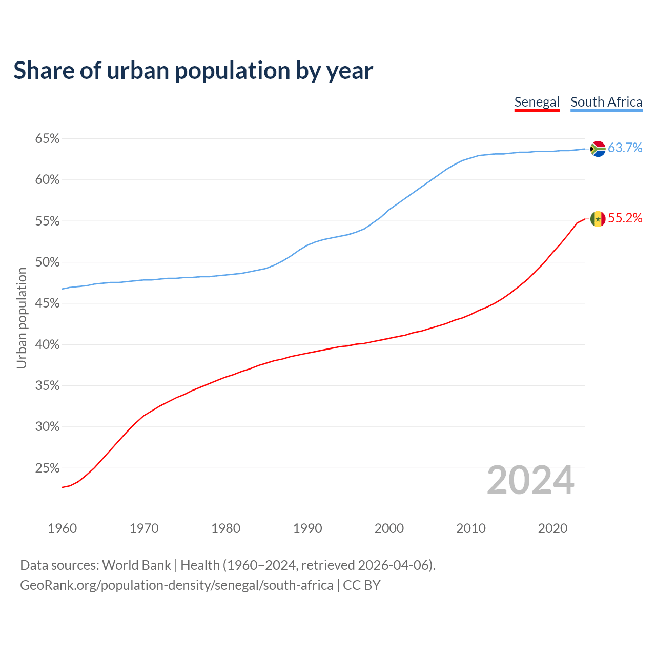 From 2004 to 2024, the share of urban population changed from 41.6% to 55.2% in Senegal and from 59.1% to 63.7% in South Africa.