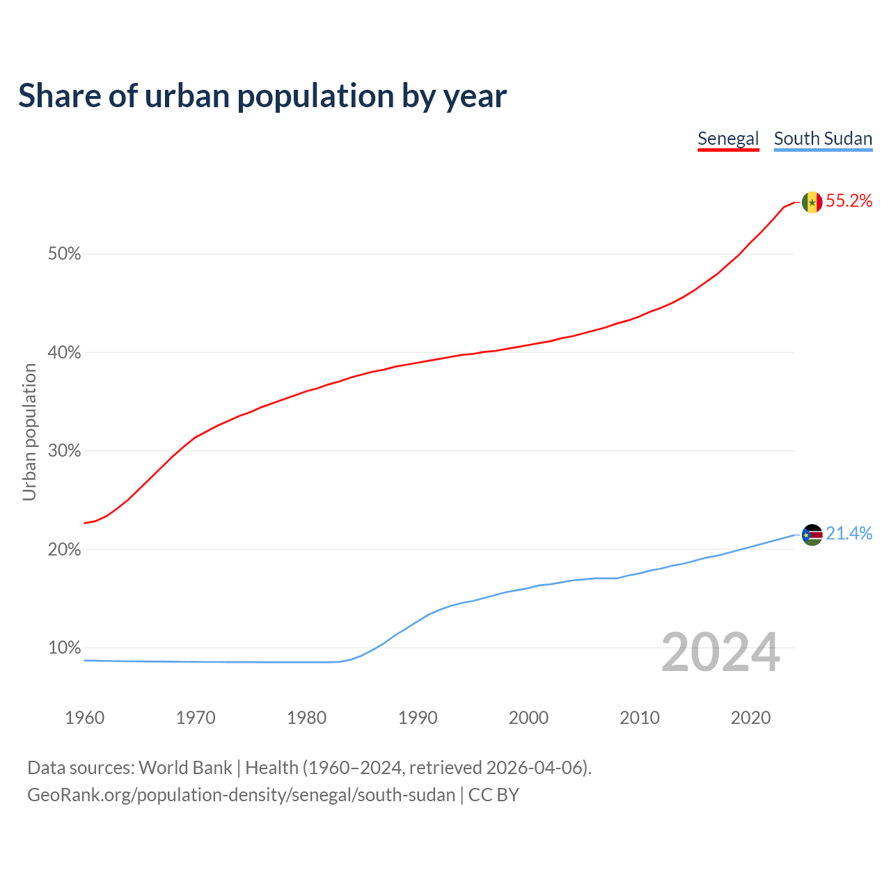 From 2004 to 2024, the share of urban population changed from 41.6% to 55.2% in Senegal and from 16.8% to 21.4% in South Sudan.