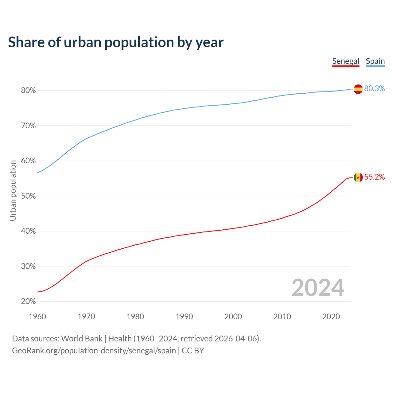 From 2004 to 2024, the share of urban population changed from 41.6% to 55.2% in Senegal and from 77% to 80.3% in Spain.