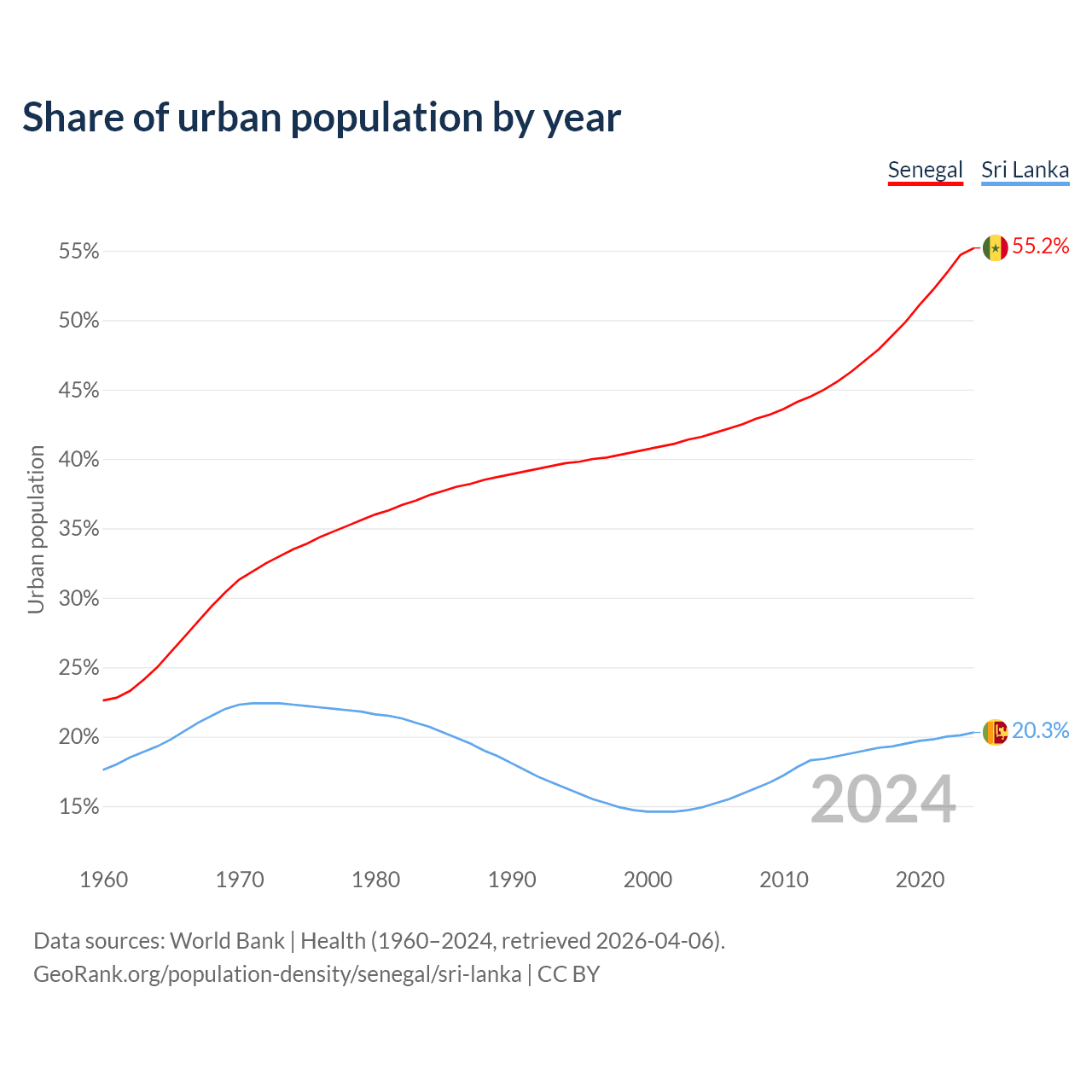 From 2004 to 2024, the share of urban population changed from 41.6% to 55.2% in Senegal and from 14.9% to 20.3% in Sri Lanka.