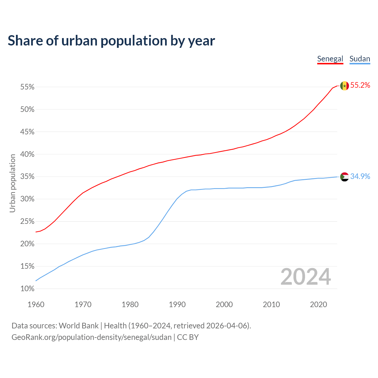 From 2004 to 2024, the share of urban population changed from 41.6% to 55.2% in Senegal and from 32.4% to 34.9% in Sudan.