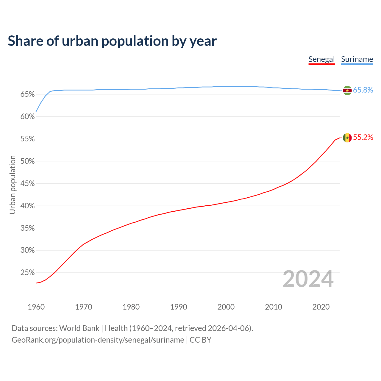 From 2004 to 2024, the share of urban population changed from 41.6% to 55.2% in Senegal and from 66.7% to 65.8% in Suriname.