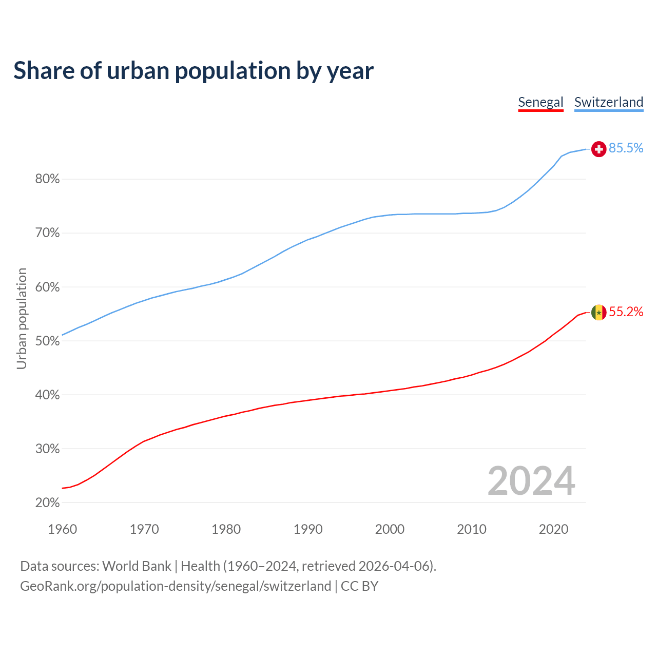 From 2004 to 2024, the share of urban population changed from 41.6% to 55.2% in Senegal and from 73.5% to 85.5% in Switzerland.