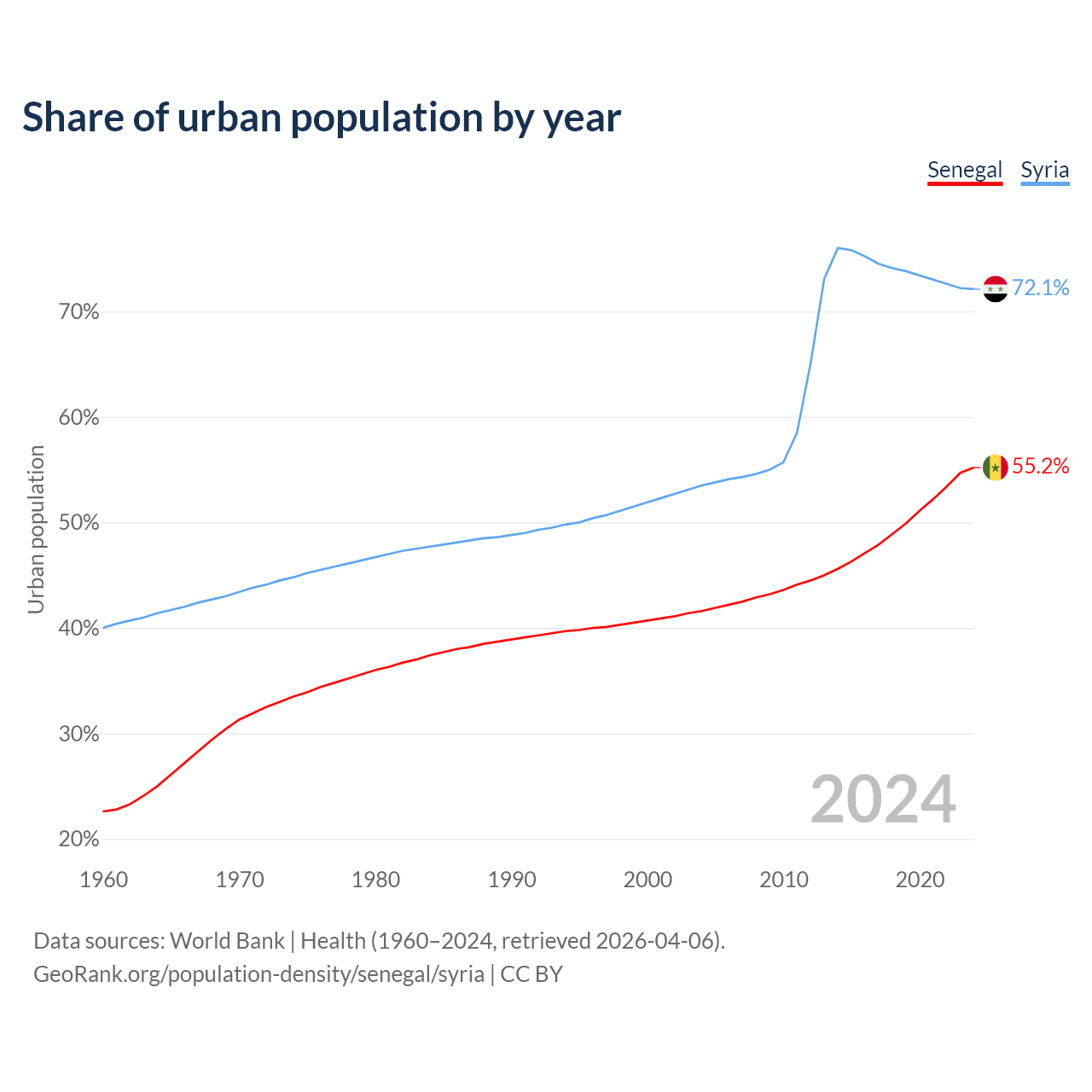 From 2004 to 2024, the share of urban population changed from 41.6% to 55.2% in Senegal and from 53.5% to 72.1% in Syria.