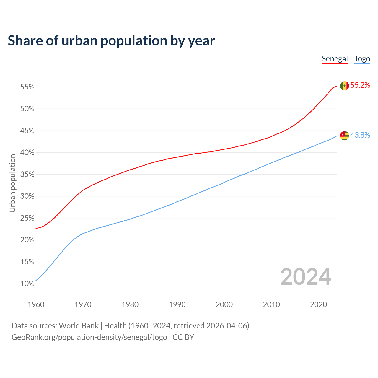 From 2004 to 2024, the share of urban population changed from 41.6% to 55.2% in Senegal and from 34.9% to 43.8% in Togo.