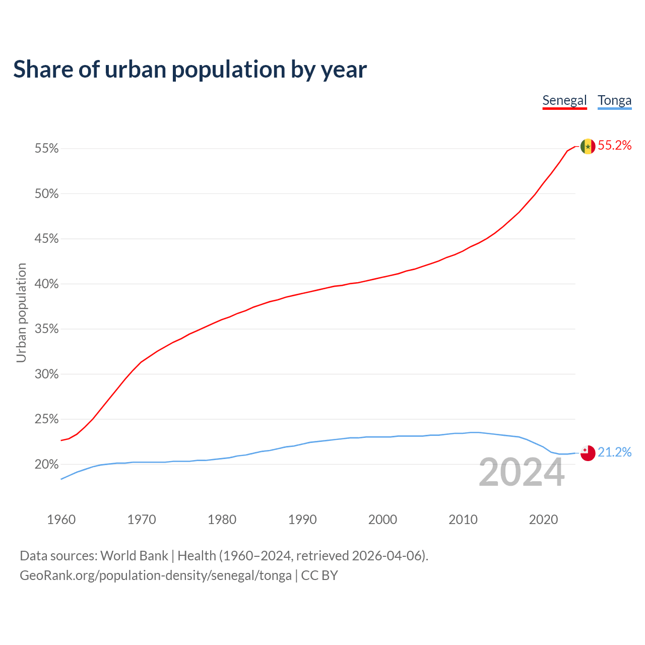From 2004 to 2024, the share of urban population changed from 41.6% to 55.2% in Senegal and from 23.1% to 21.2% in Tonga.