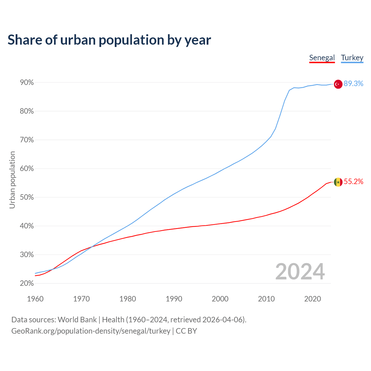 From 2004 to 2024, the share of urban population changed from 41.6% to 55.2% in Senegal and from 62.4% to 89.3% in Turkey.
