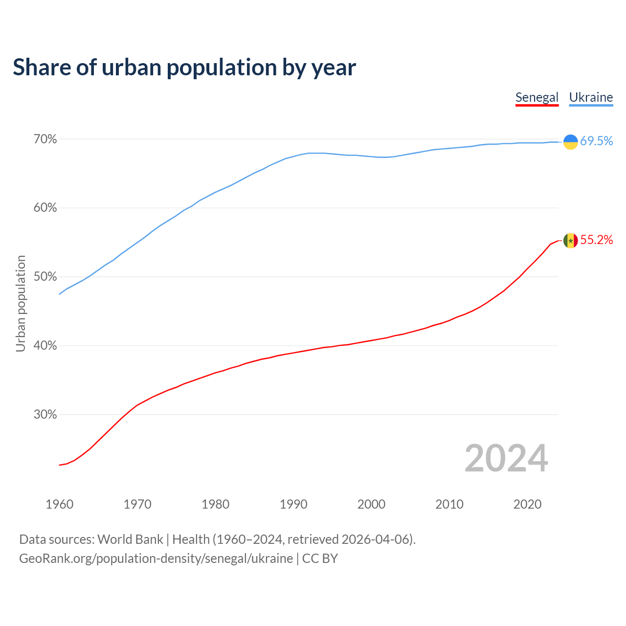 From 2004 to 2024, the share of urban population changed from 41.6% to 55.2% in Senegal and from 67.6% to 69.5% in Ukraine.