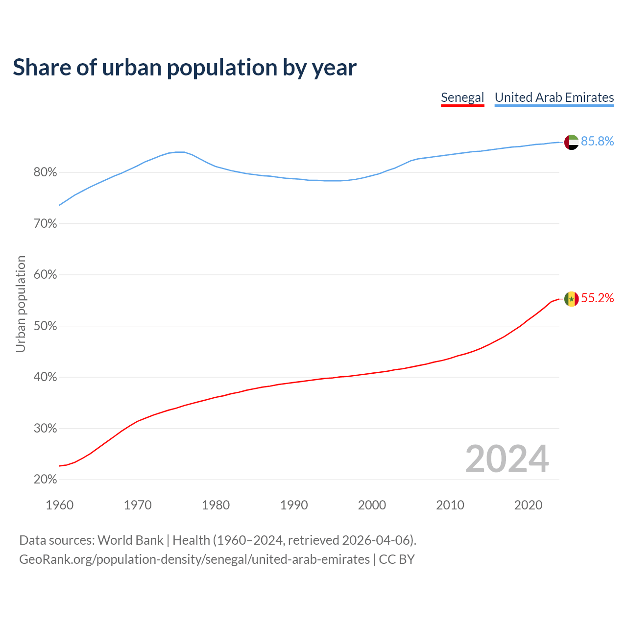 From 2004 to 2024, the share of urban population changed from 41.6% to 55.2% in Senegal and from 81.5% to 85.8% in the United Arab Emirates.