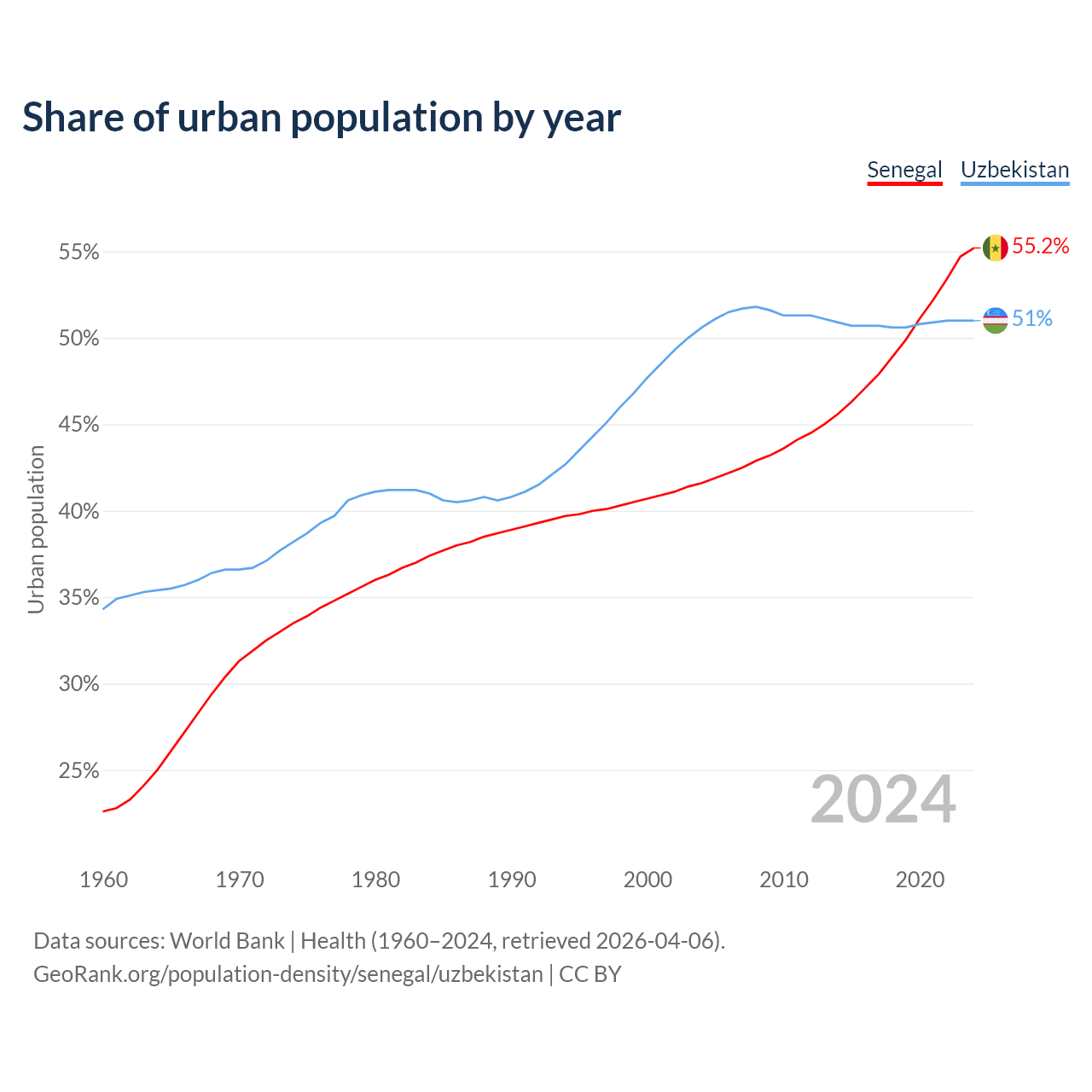 From 2004 to 2024, the share of urban population changed from 41.6% to 55.2% in Senegal and from 50.6% to 51% in Uzbekistan.