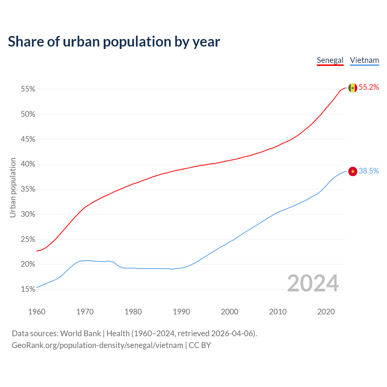 From 2004 to 2024, the share of urban population changed from 41.6% to 55.2% in Senegal and from 26.8% to 38.5% in Vietnam.