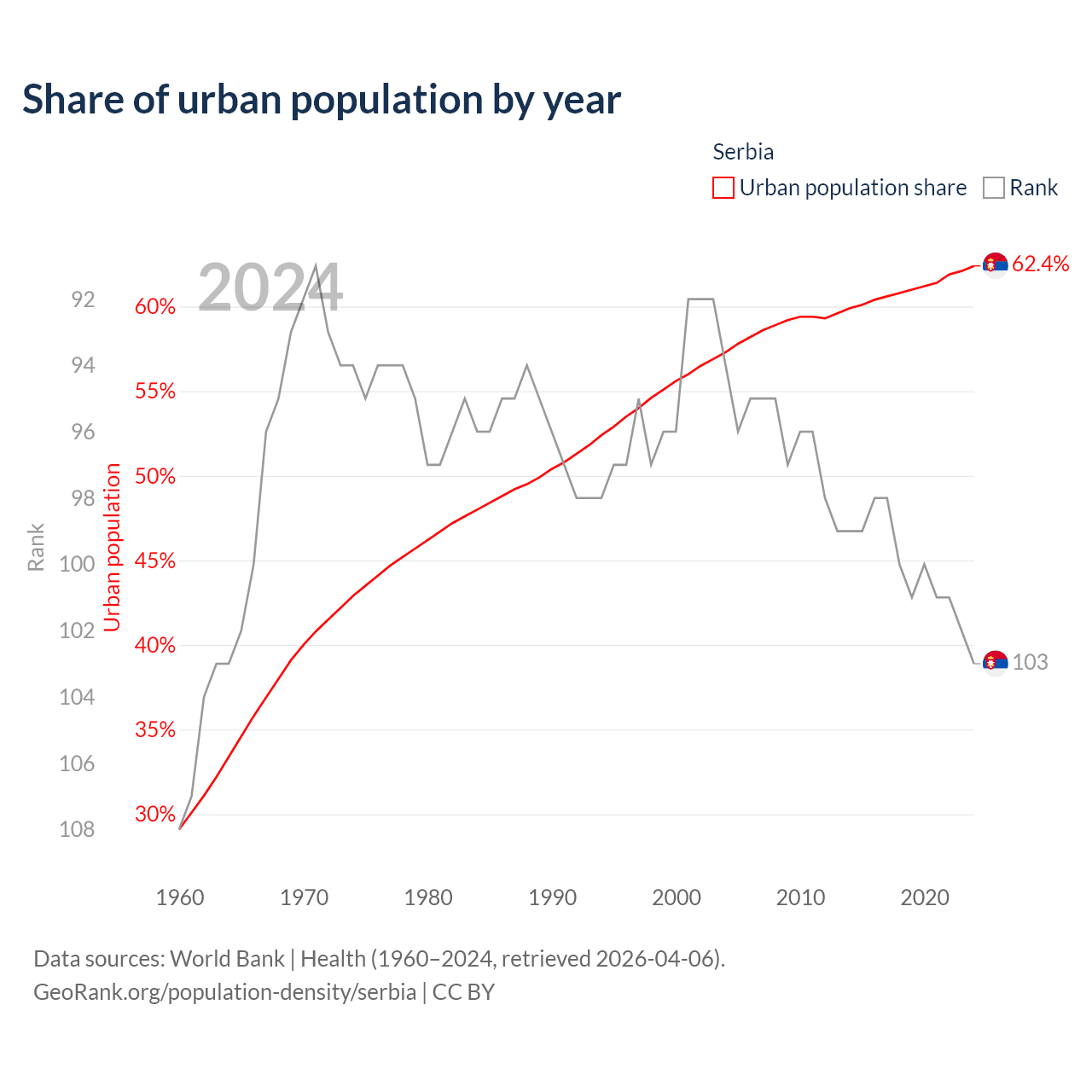 This chart shows the share of urban population in Serbia from 1960 to 2024: 29.1% lived in urban areas in 1960, 55.6% in 2000, and 62.4% in 2024.
