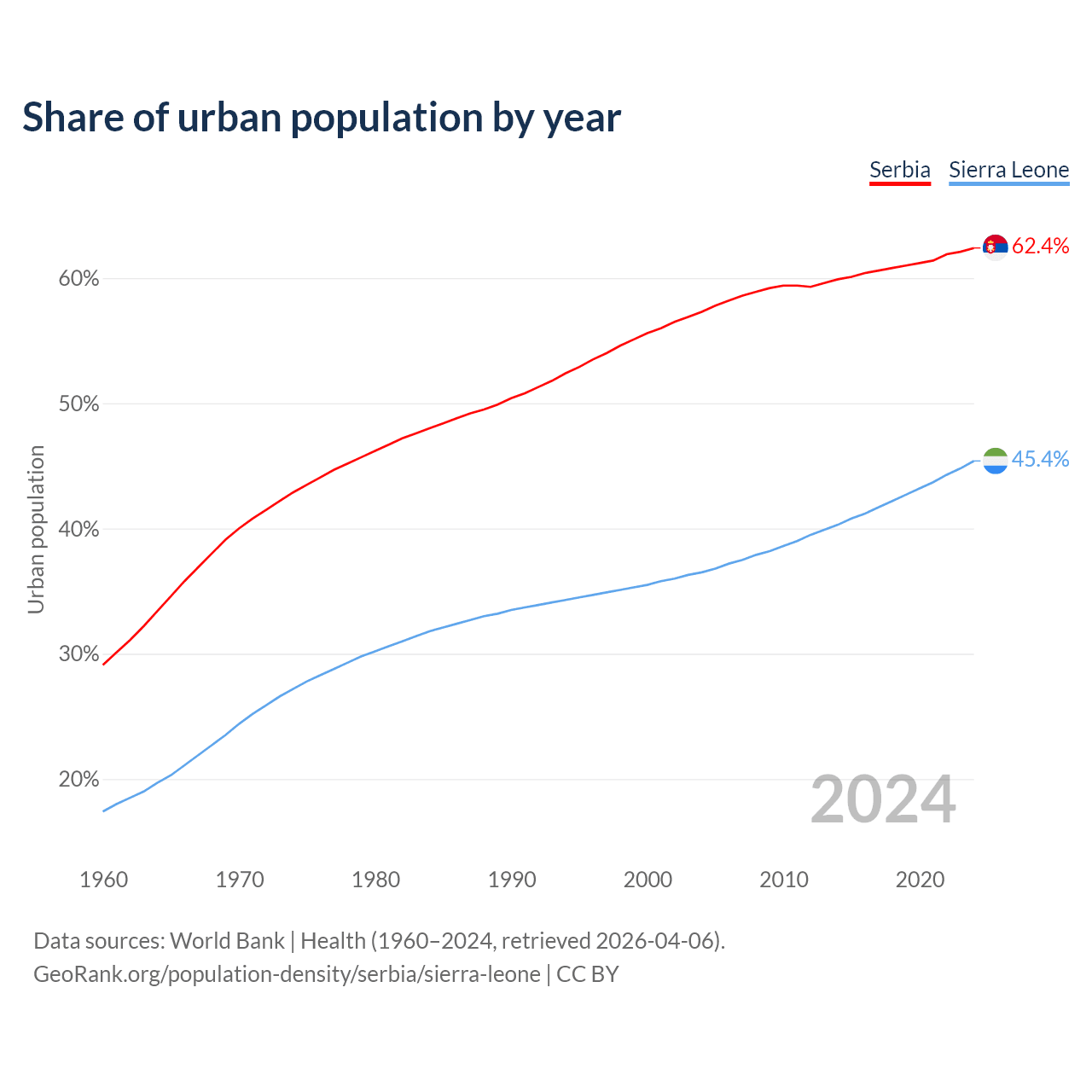 From 2004 to 2024, the share of urban population changed from 57.3% to 62.4% in Serbia and from 36.5% to 45.4% in Sierra Leone.