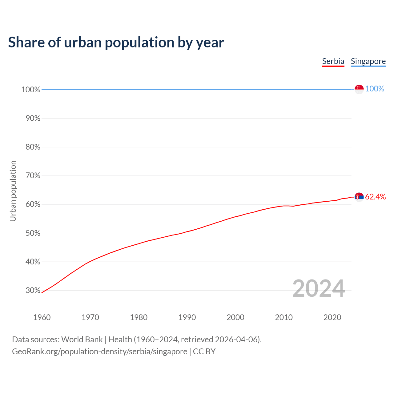 From 2004 to 2024, the share of urban population changed from 57.3% to 62.4% in Serbia and from 100% to 100% in Singapore.