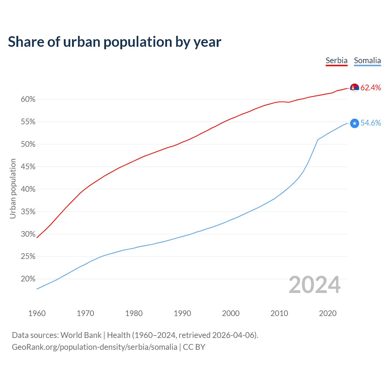 From 2004 to 2024, the share of urban population changed from 57.3% to 62.4% in Serbia and from 35% to 54.6% in Somalia.