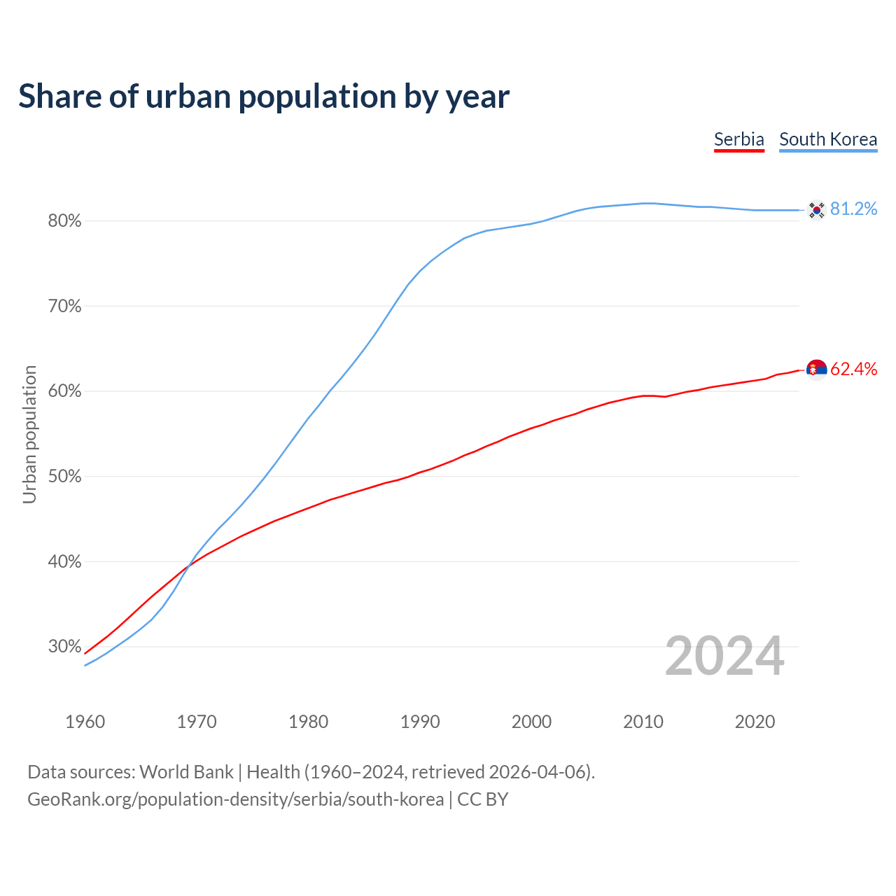 From 2004 to 2024, the share of urban population changed from 57.3% to 62.4% in Serbia and from 81.1% to 81.2% in South Korea.