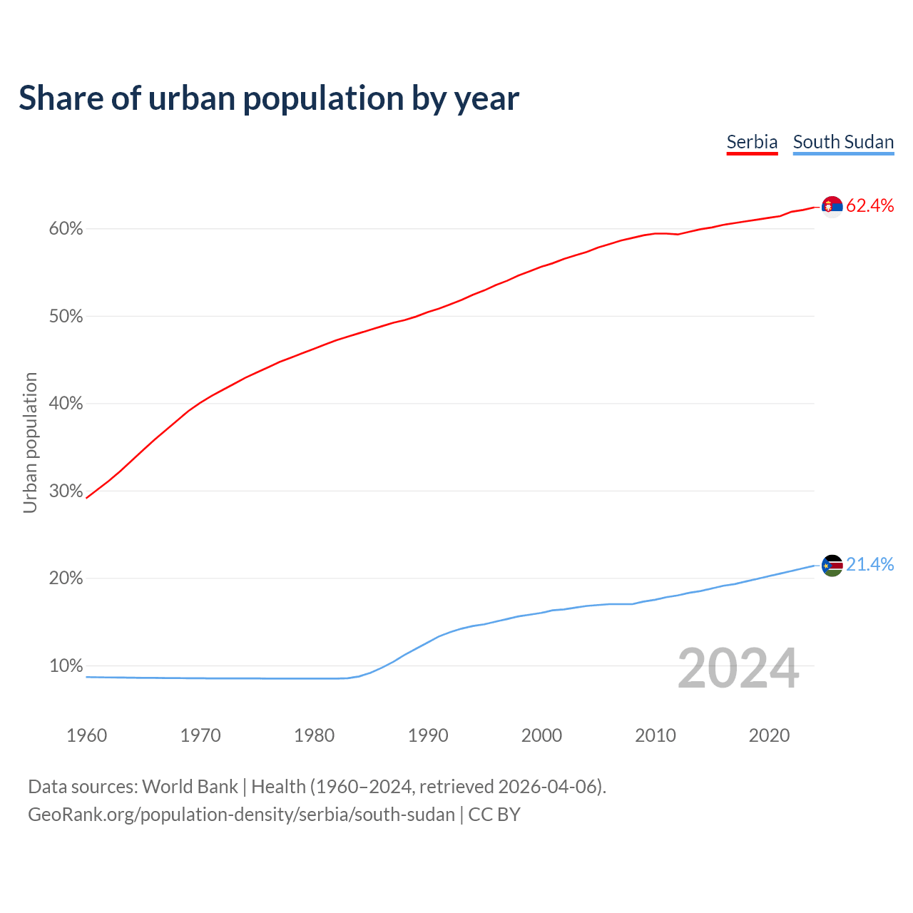 From 2004 to 2024, the share of urban population changed from 57.3% to 62.4% in Serbia and from 16.8% to 21.4% in South Sudan.