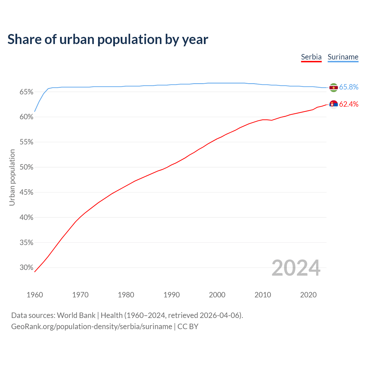 From 2004 to 2024, the share of urban population changed from 57.3% to 62.4% in Serbia and from 66.7% to 65.8% in Suriname.