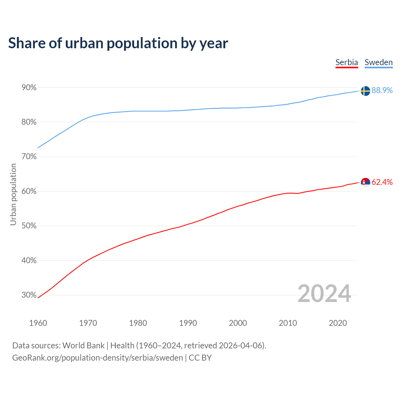 From 2004 to 2024, the share of urban population changed from 57.3% to 62.4% in Serbia and from 84.3% to 88.9% in Sweden.