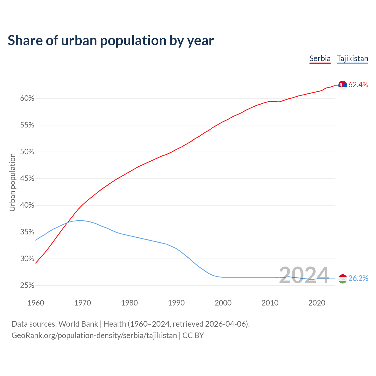 From 2004 to 2024, the share of urban population changed from 57.3% to 62.4% in Serbia and from 26.5% to 26.2% in Tajikistan.
