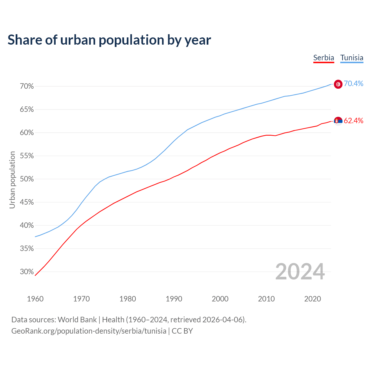 From 2004 to 2024, the share of urban population changed from 57.3% to 62.4% in Serbia and from 64.9% to 70.4% in Tunisia.