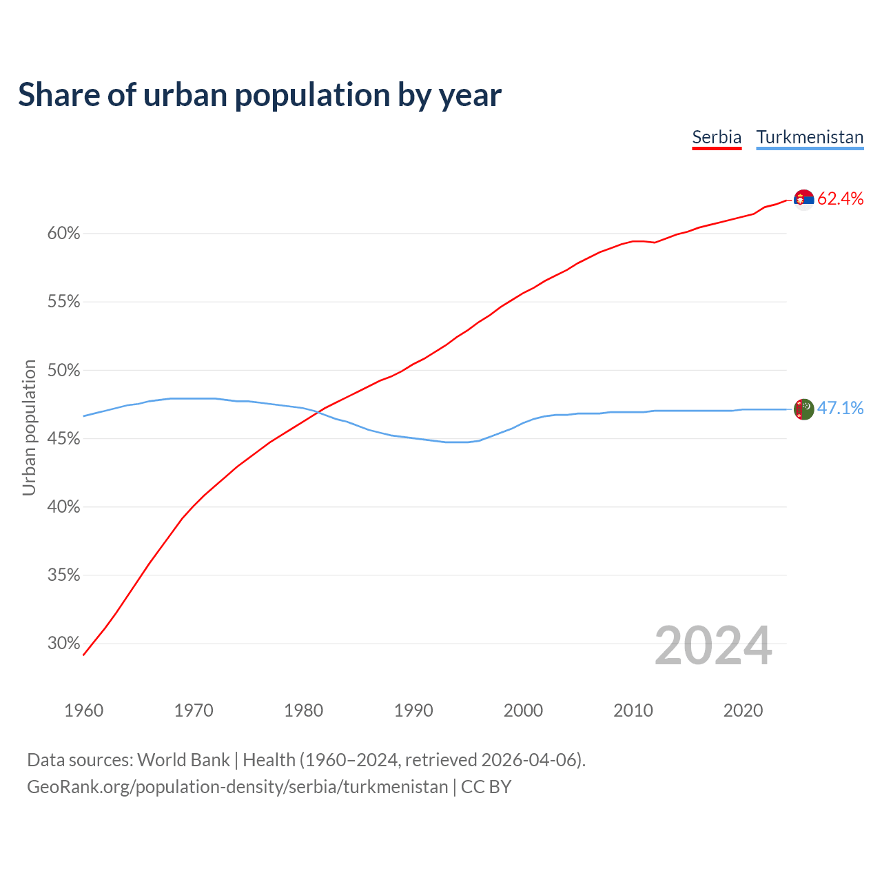From 2004 to 2024, the share of urban population changed from 57.3% to 62.4% in Serbia and from 46.7% to 47.1% in Turkmenistan.