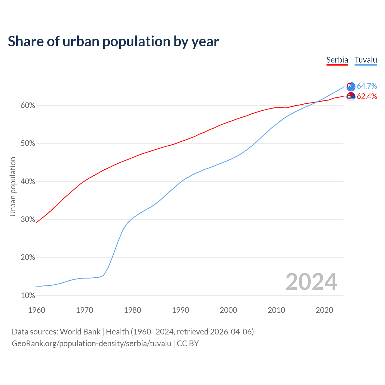 From 2004 to 2024, the share of urban population changed from 57.3% to 62.4% in Serbia and from 48.4% to 64.7% in Tuvalu.