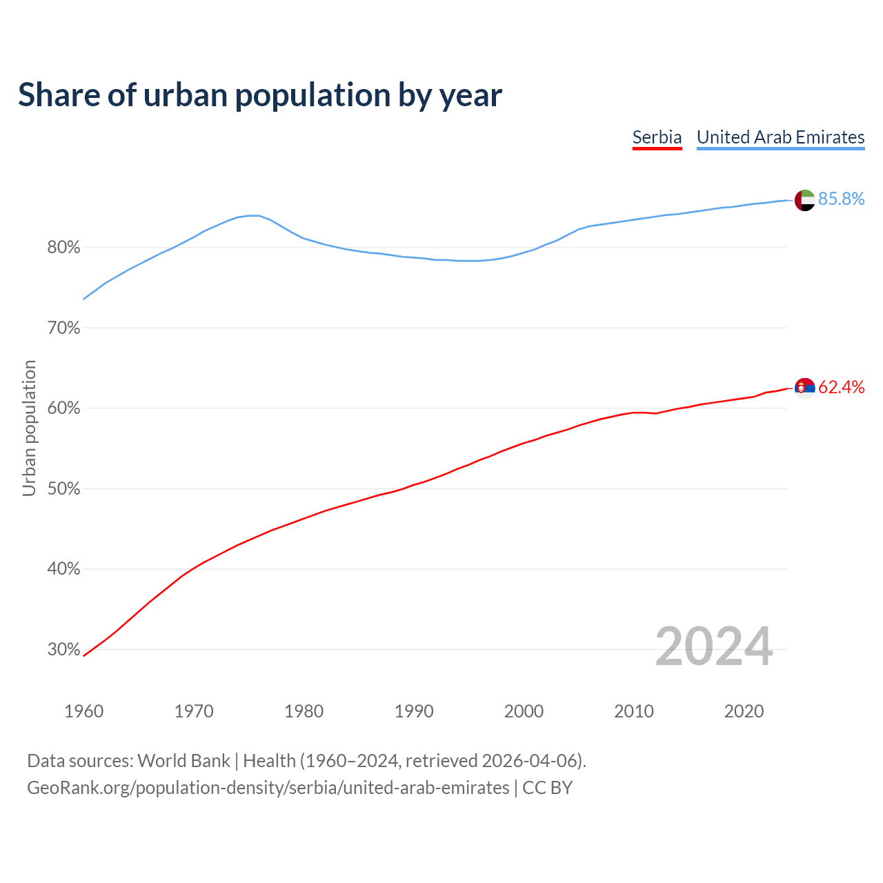 From 2004 to 2024, the share of urban population changed from 57.3% to 62.4% in Serbia and from 81.5% to 85.8% in the United Arab Emirates.