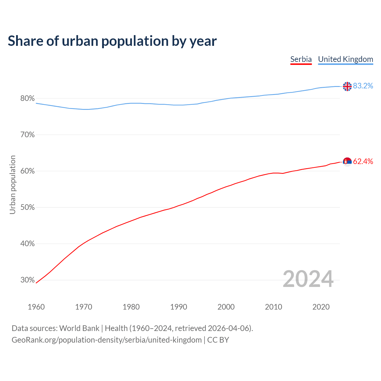 From 2004 to 2024, the share of urban population changed from 57.3% to 62.4% in Serbia and from 80.3% to 83.2% in the United Kingdom.