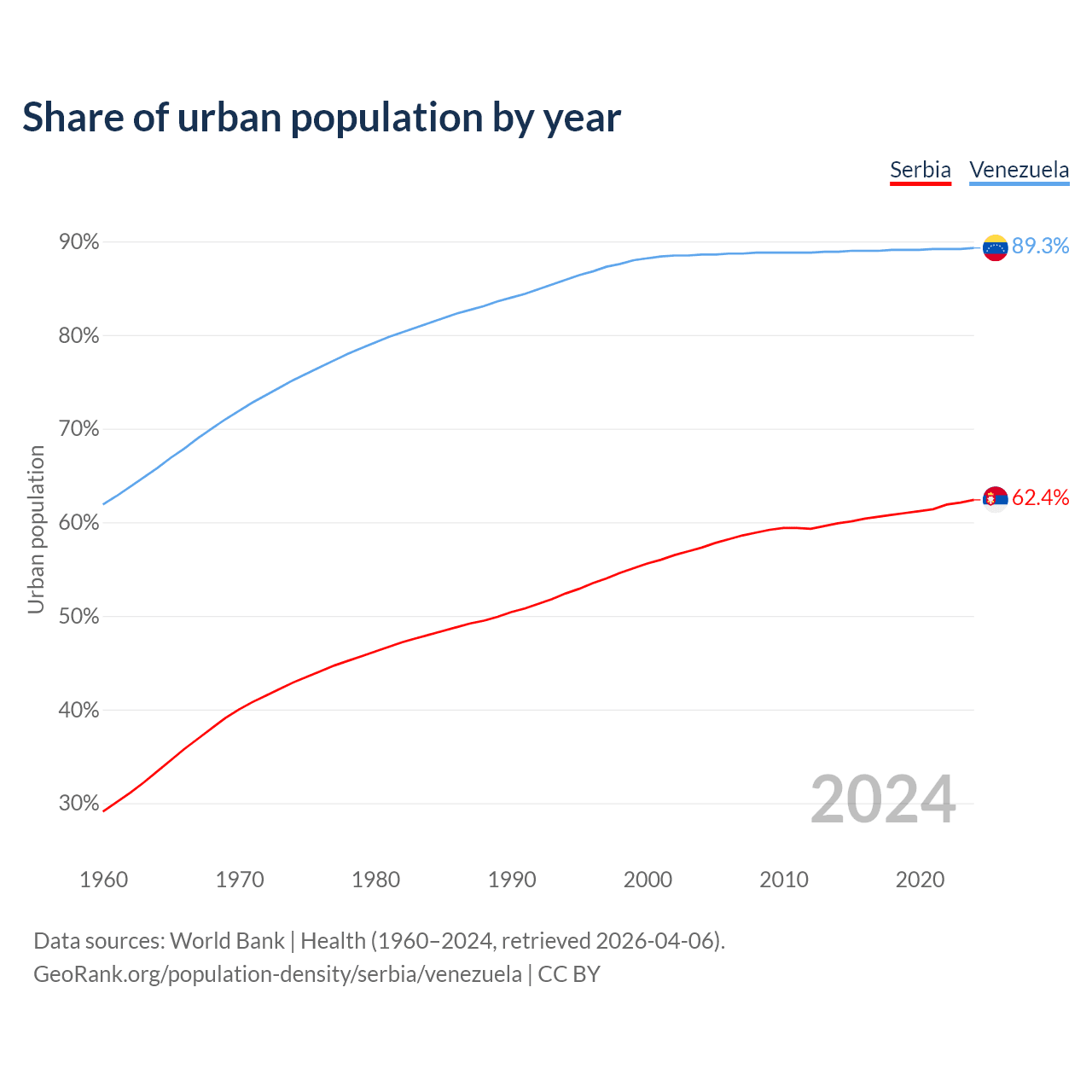 From 2004 to 2024, the share of urban population changed from 57.3% to 62.4% in Serbia and from 88.6% to 89.3% in Venezuela.