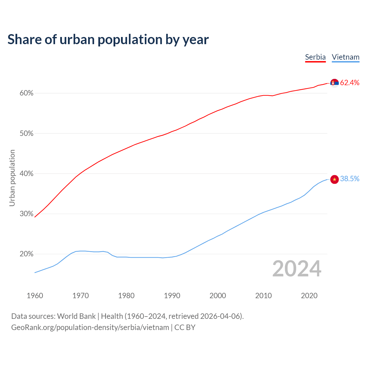 From 2004 to 2024, the share of urban population changed from 57.3% to 62.4% in Serbia and from 26.8% to 38.5% in Vietnam.