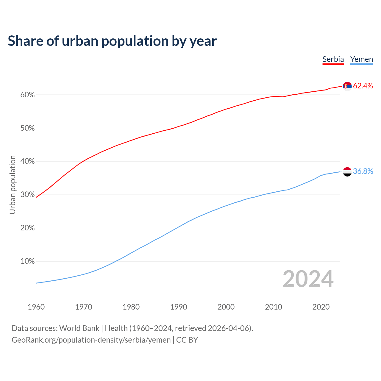 From 2004 to 2024, the share of urban population changed from 57.3% to 62.4% in Serbia and from 28.5% to 36.8% in Yemen.