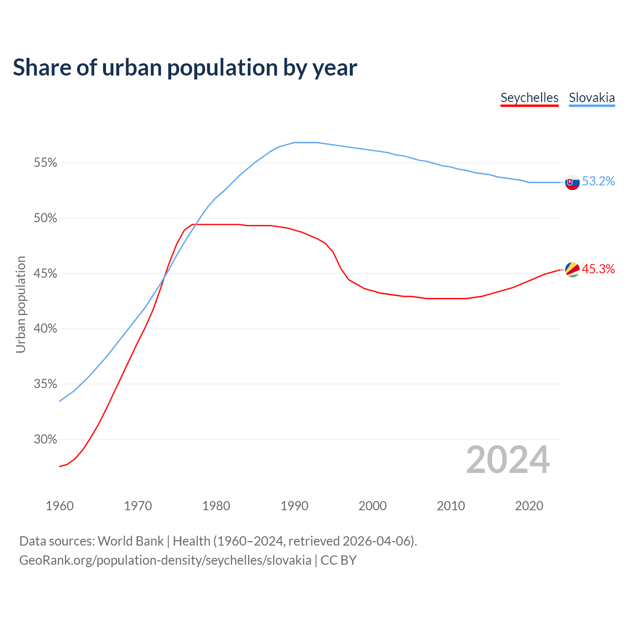 From 2004 to 2024, the share of urban population changed from 42.9% to 45.3% in the Seychelles and from 55.6% to 53.2% in Slovakia.