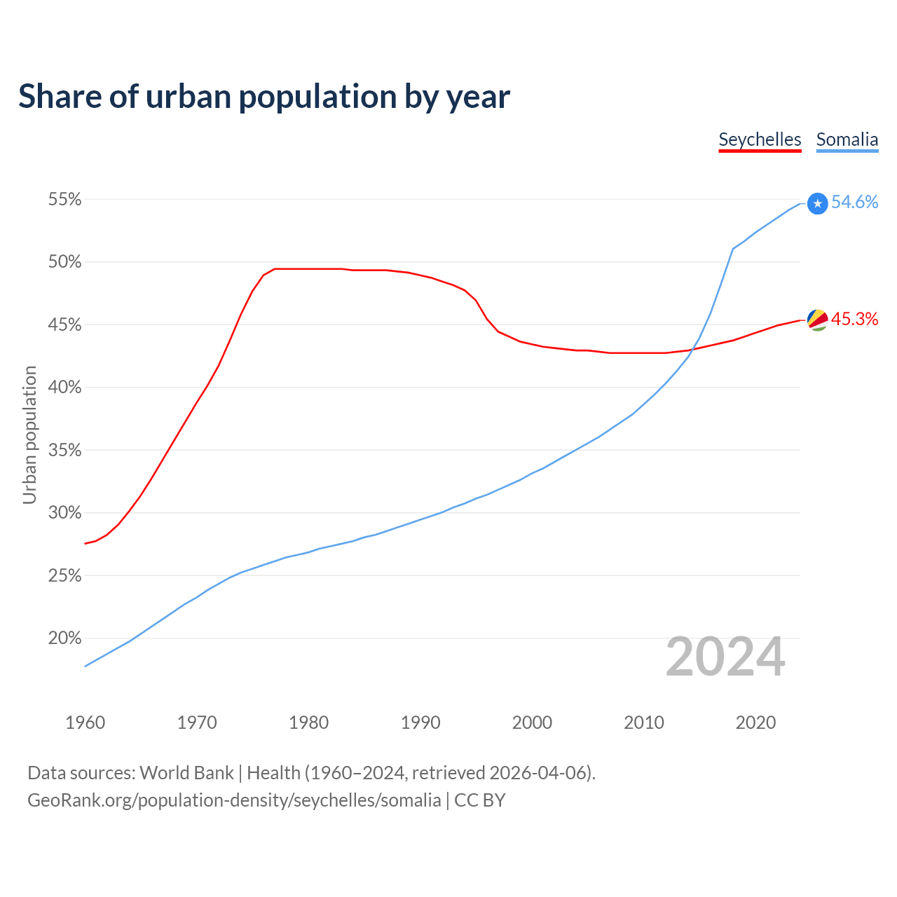 From 2004 to 2024, the share of urban population changed from 42.9% to 45.3% in the Seychelles and from 35% to 54.6% in Somalia.
