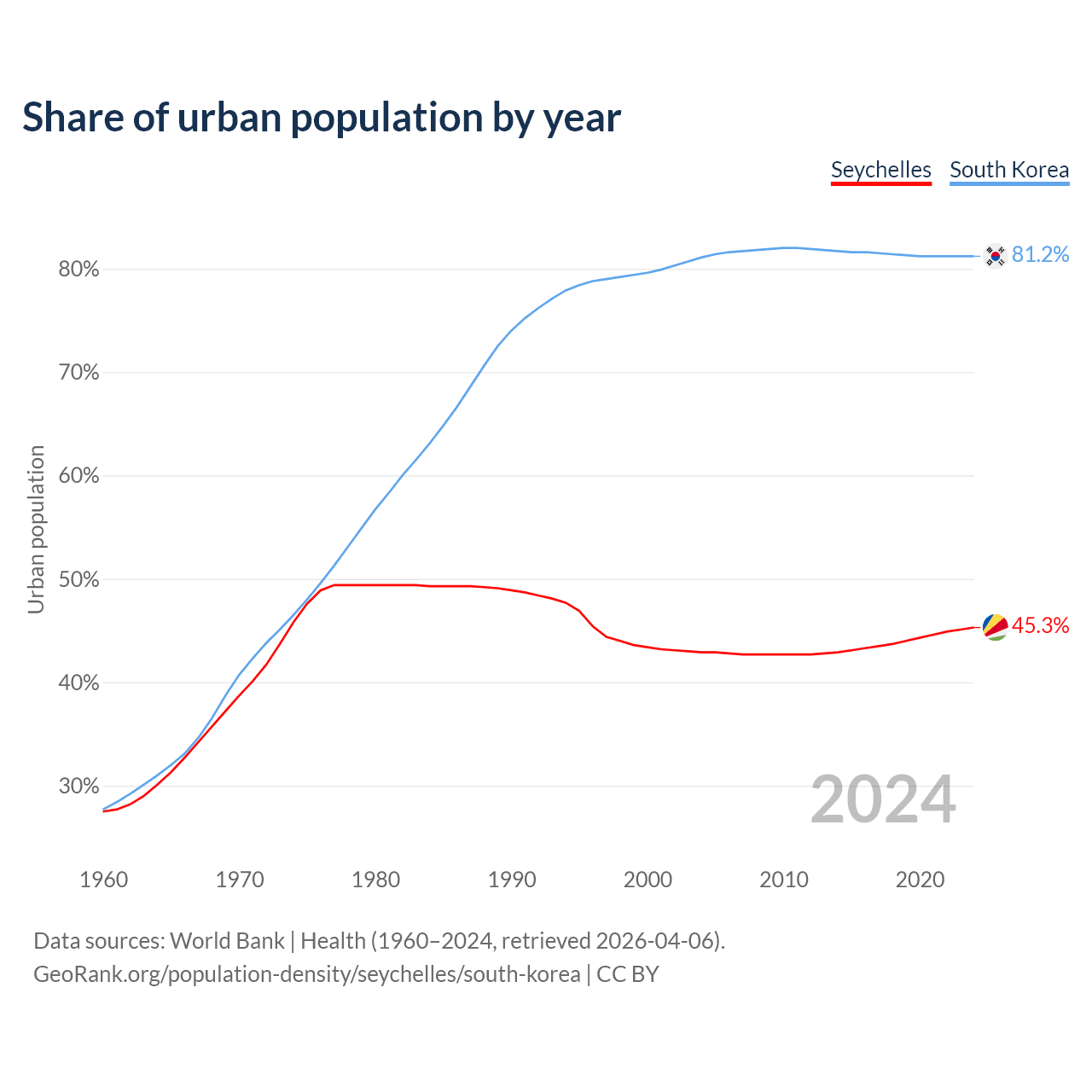 From 2004 to 2024, the share of urban population changed from 42.9% to 45.3% in the Seychelles and from 81.1% to 81.2% in South Korea.