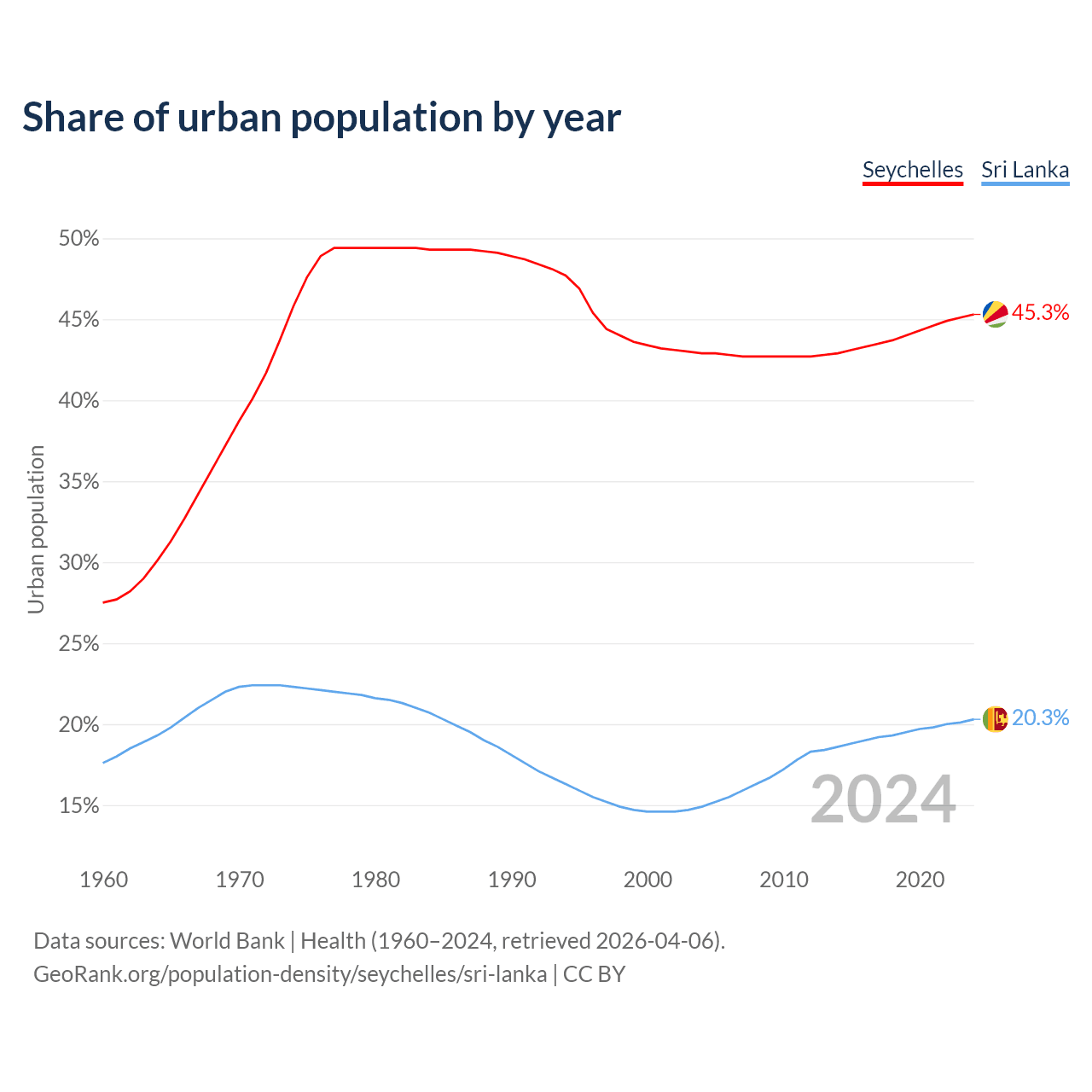From 2004 to 2024, the share of urban population changed from 42.9% to 45.3% in the Seychelles and from 14.9% to 20.3% in Sri Lanka.