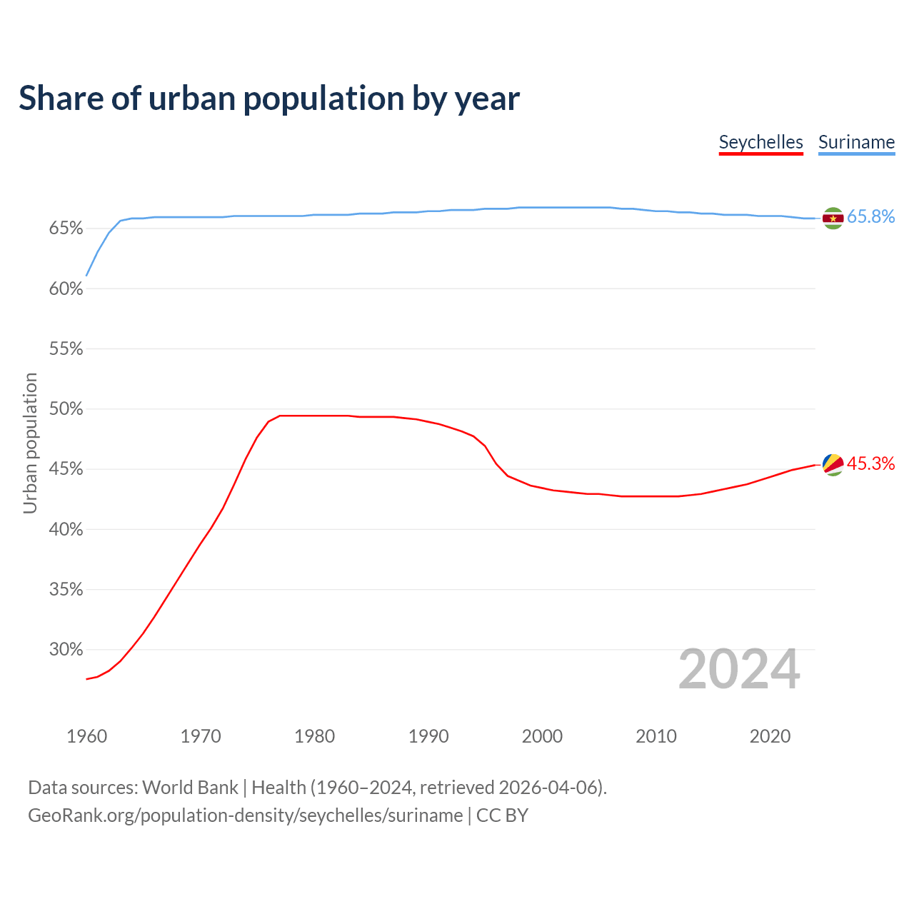 From 2004 to 2024, the share of urban population changed from 42.9% to 45.3% in the Seychelles and from 66.7% to 65.8% in Suriname.
