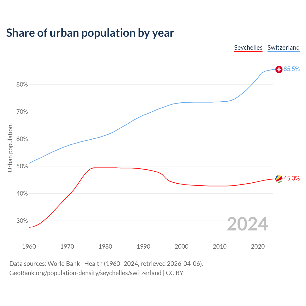 From 2004 to 2024, the share of urban population changed from 42.9% to 45.3% in the Seychelles and from 73.5% to 85.5% in Switzerland.