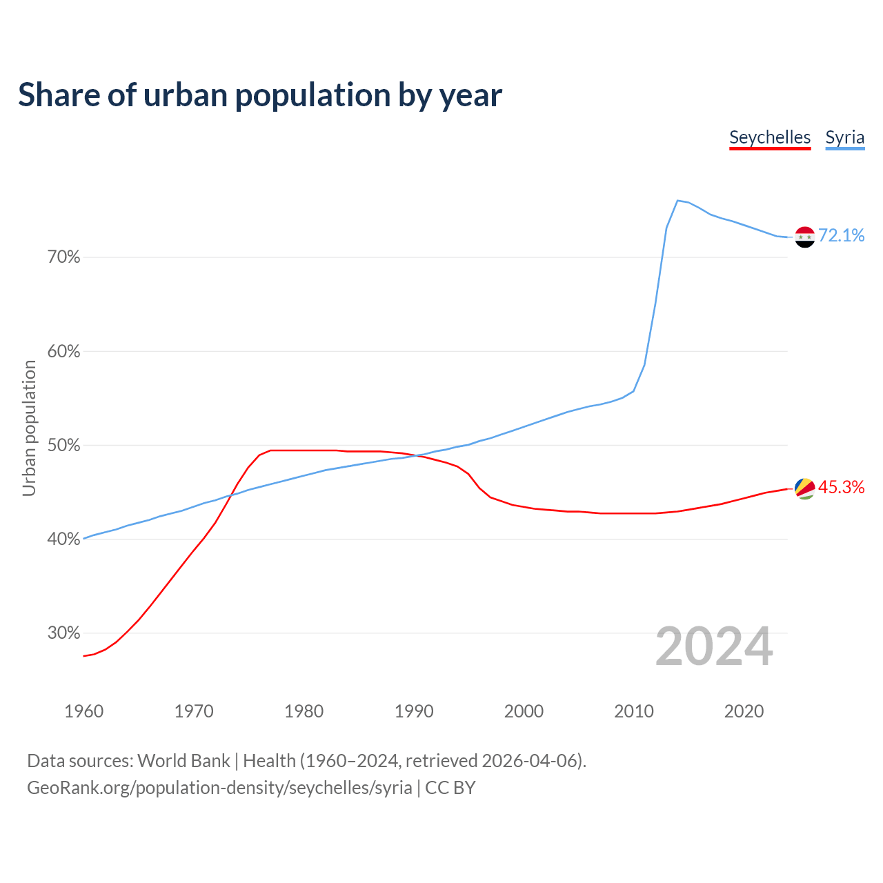 From 2004 to 2024, the share of urban population changed from 42.9% to 45.3% in the Seychelles and from 53.5% to 72.1% in Syria.