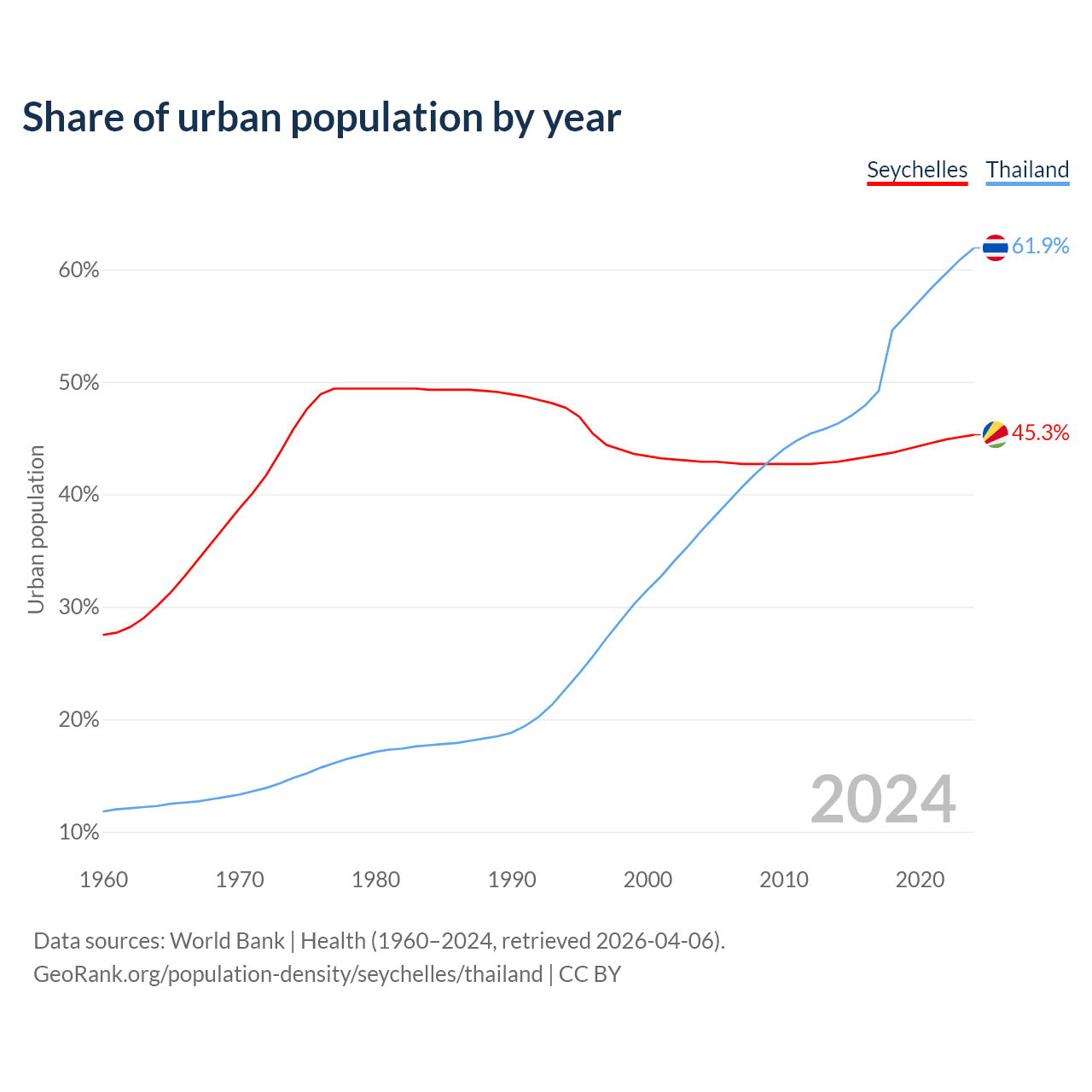 From 2004 to 2024, the share of urban population changed from 42.9% to 45.3% in the Seychelles and from 36.8% to 61.9% in Thailand.