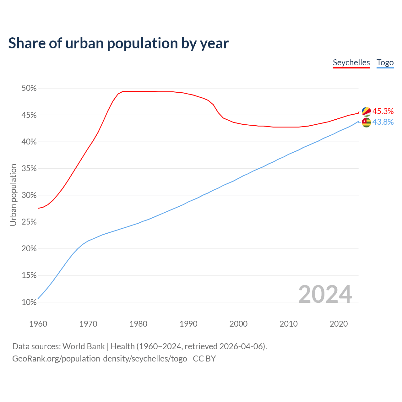 From 2004 to 2024, the share of urban population changed from 42.9% to 45.3% in the Seychelles and from 34.9% to 43.8% in Togo.