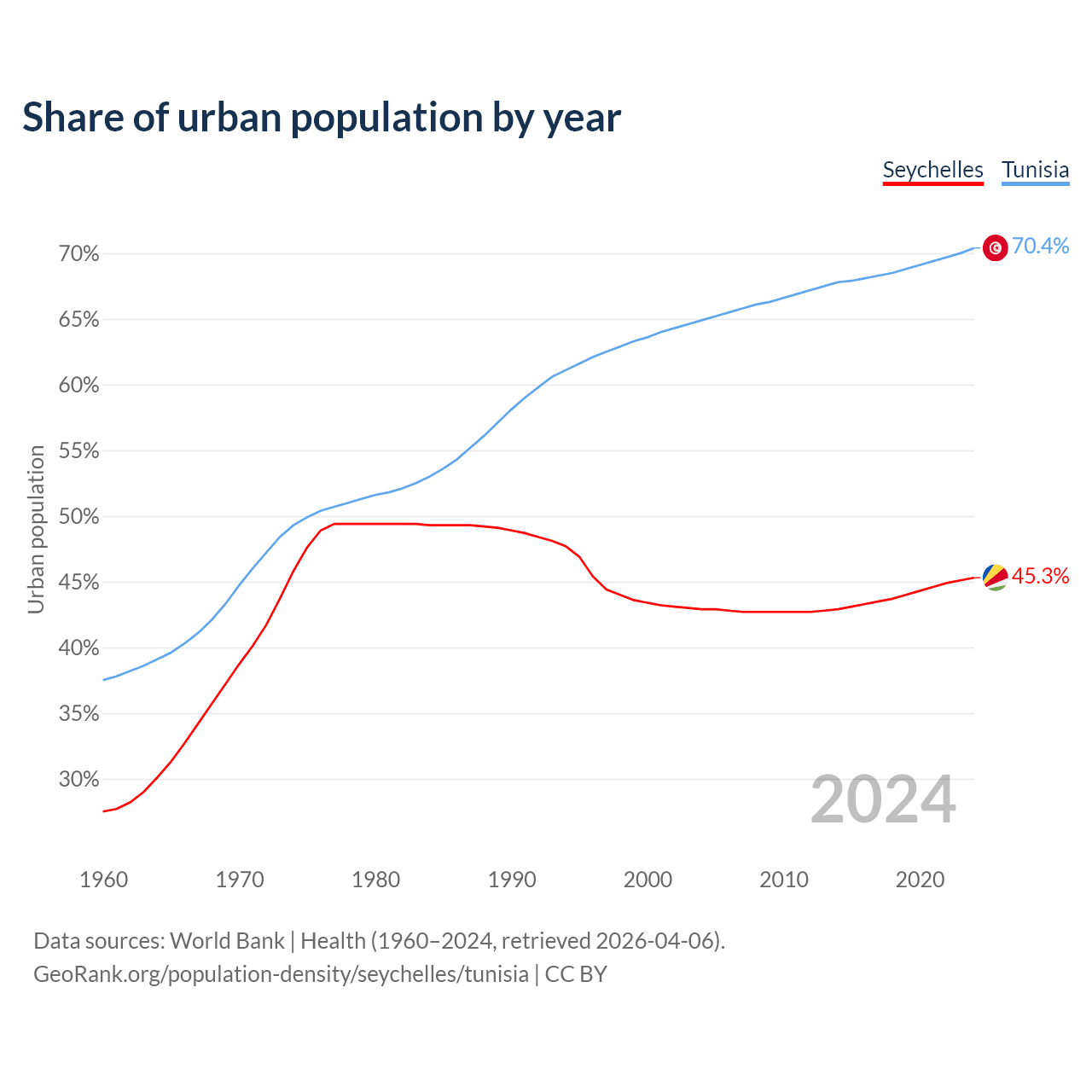 From 2004 to 2024, the share of urban population changed from 42.9% to 45.3% in the Seychelles and from 64.9% to 70.4% in Tunisia.