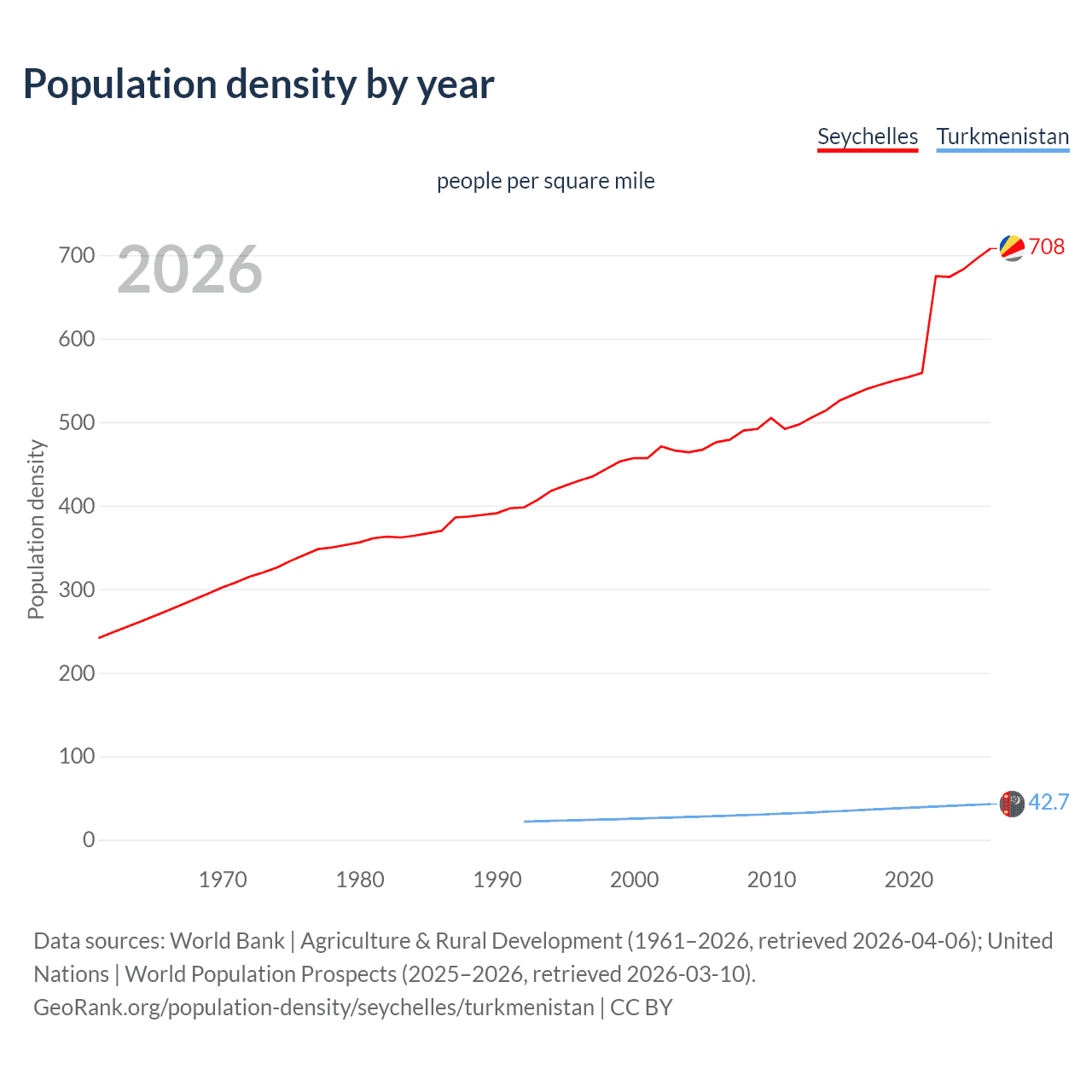 From 2006 to 2026, population density in the Seychelles increased by 48.7%, compared to a 50.5% growth in Turkmenistan.