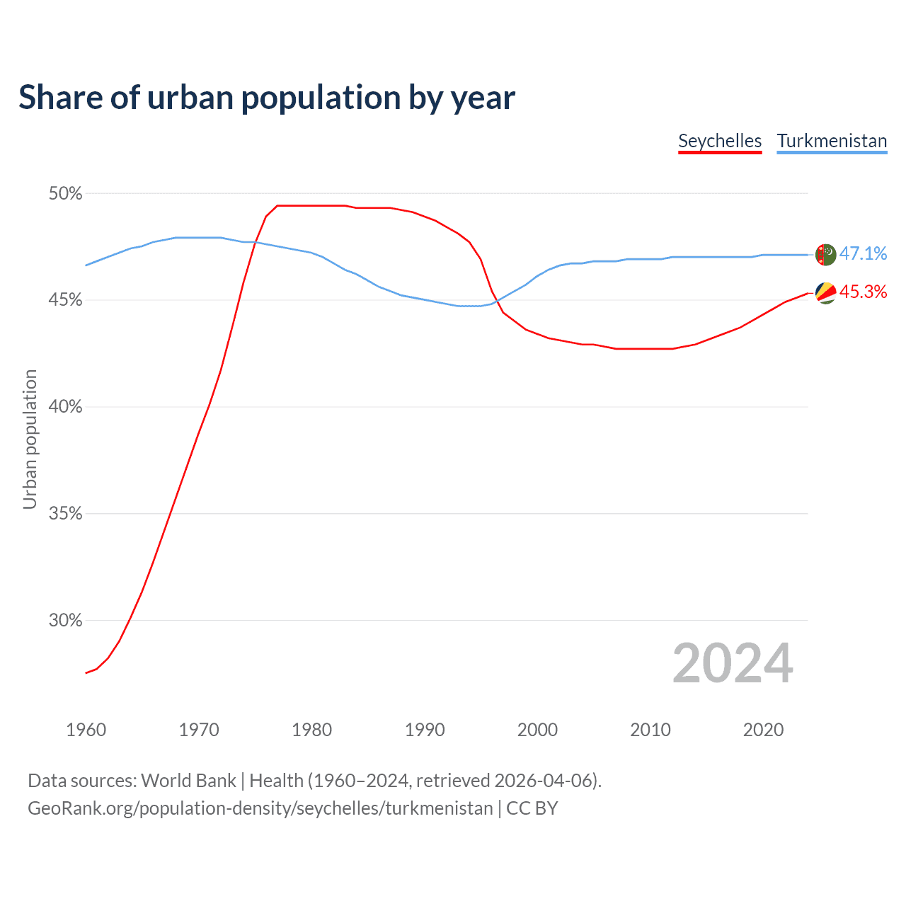 From 2004 to 2024, the share of urban population changed from 42.9% to 45.3% in the Seychelles and from 46.7% to 47.1% in Turkmenistan.