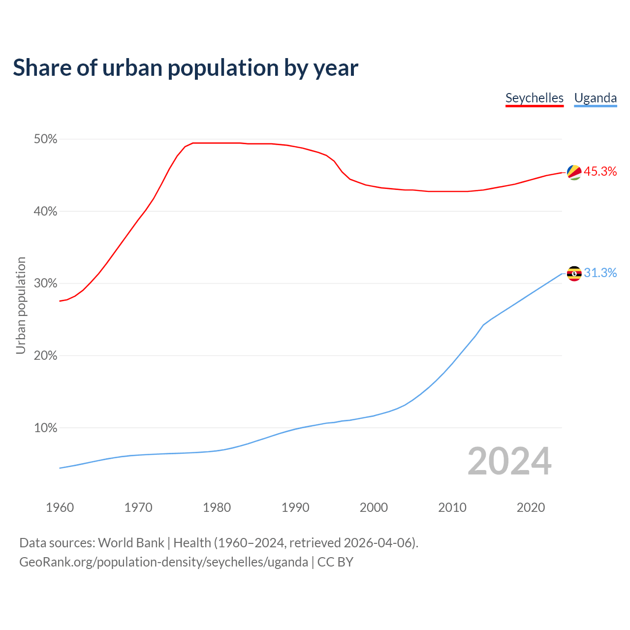 From 2004 to 2024, the share of urban population changed from 42.9% to 45.3% in the Seychelles and from 13.1% to 31.3% in Uganda.