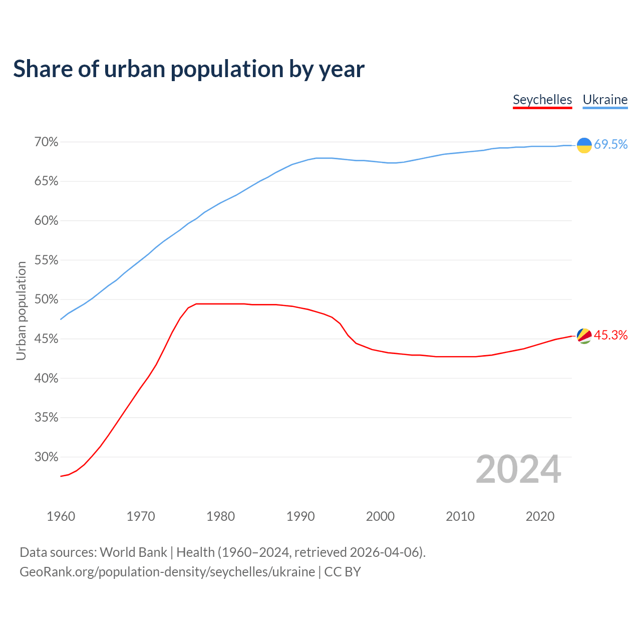 From 2004 to 2024, the share of urban population changed from 42.9% to 45.3% in the Seychelles and from 67.6% to 69.5% in Ukraine.