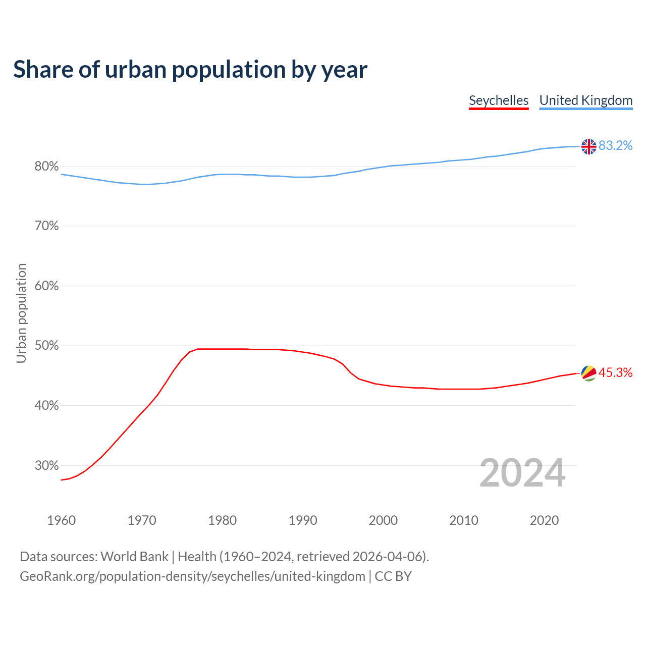 From 2004 to 2024, the share of urban population changed from 42.9% to 45.3% in the Seychelles and from 80.3% to 83.2% in the United Kingdom.