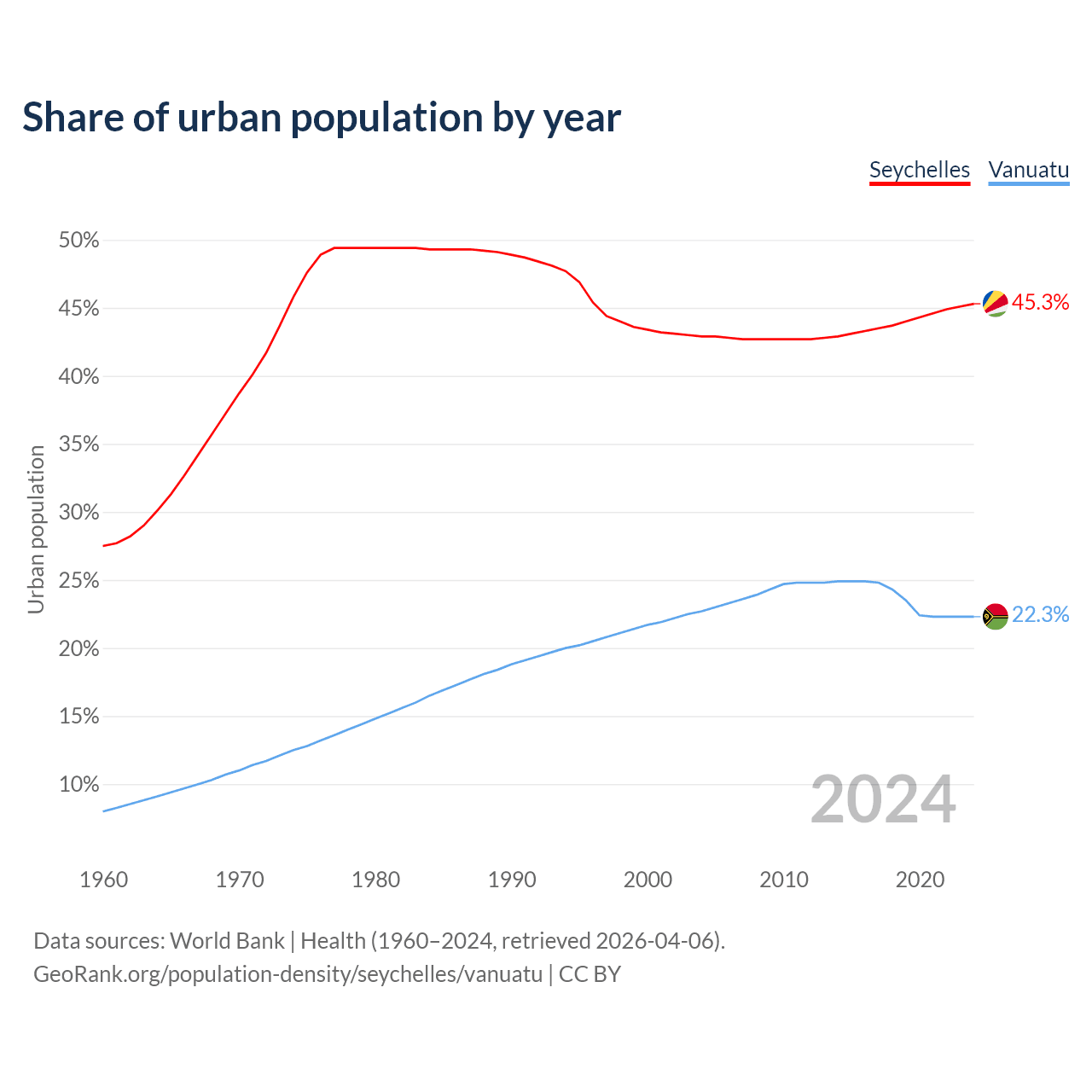 From 2004 to 2024, the share of urban population changed from 42.9% to 45.3% in the Seychelles and from 22.7% to 22.3% in Vanuatu.